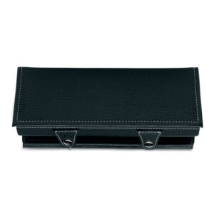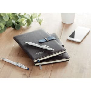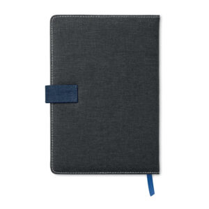 • Beležnica A5 z 80 podloženimi stranicami v platneni bombažni platnici (videz kavbojk) z zapiralnim trakom, zanko za pero in trakom.